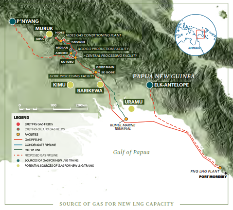 Extensive studies have confirmed this development concept is the most efficient way of expanding LNG capacity in PNG, delivering significant construction and operating cost savings that will benefit all stakeholders. The expansion trains will be underpinned by gas resources from the Elk-Antelope fields (PRL 15 - Papua LNG) in the Onshore Gulf and the PNG LNG Project and P'nyang fields (PRL 3) in the North-West Highlands.
